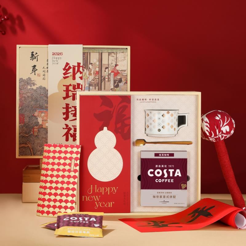 新年大禮包 119x276x93mm 五福臨門錘、新春對聯(lián)、新年紅包*6 歐式咖啡杯 107x64mm(165ml) 陶瓷/烤花 咖啡勺 136x13mm 金屬 COSTA咖啡 110x130mm(10g*5片) 掛耳式咖啡